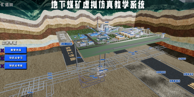 实验项目依据三维模拟仿真和VR技术,还原了大型煤矿的工业广场和井下真实的生产环境等场景,通过构建综采放顶煤工作面生产系统,来模拟工作面采煤机的割煤、推前刮板输送机、移架、液压支架放煤、拉后部刮板输送机的整个作业过程,引导学生在对采煤设备结构、性能及操作方法了解基础上,按照作业规程和工艺参数,操作采煤设备进行割煤、放煤作业,系统掌握综采放顶煤工艺技术知识。