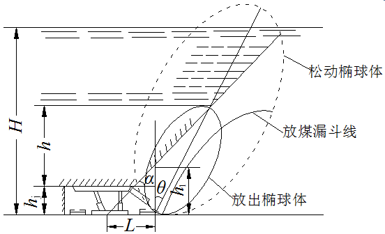 如图2所示,按顶煤不同的稳定性,顶煤将在采空区边缘形成一个暂时相对稳定的固定帮,其高度为H,并成为采空区松散煤矸运动时的约束边界,这将会改变顶煤的运动参数,也会改变放出体和松动体的形状,放出体实际上是一个偏转的椭球体。