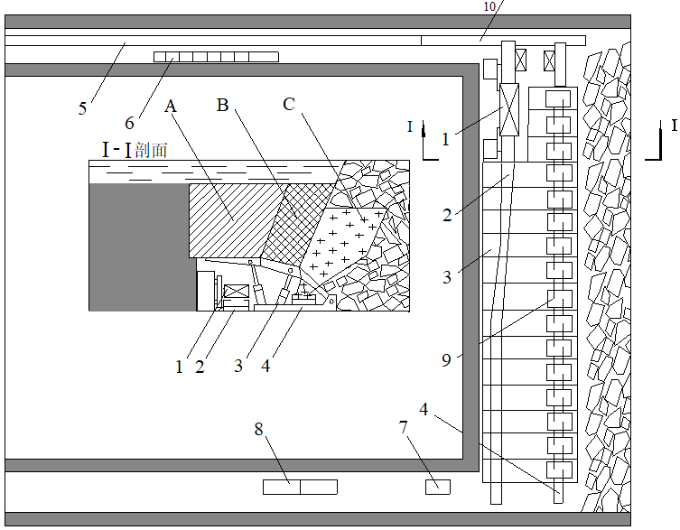 1-采煤机;2-前部输送机;3-放顶煤液压支架;4-后部输送机;5-平巷胶带输送机6-配电设备;7-安全绞车;8-泵站;9-放煤窗口;10-转载机及破碎机;A—不充分破碎煤体;B—较充分破碎煤体;C—待放出煤体