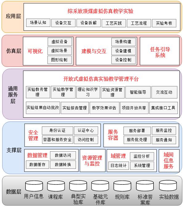 基于底层的服务,最终综采放顶煤虚拟仿真教学实验项目教学与开放共享。该框架的应用层按模块划分,利用仿真层提供的实验交互数据,设计各种典型实验环节,最后面向学校开展实验教学应用。